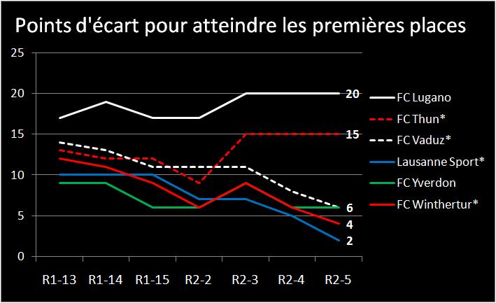 • Le FC Lausanne Sport et le FC Winthertur sont, eux aussi, sur des lignes parfaitement symétriques et ont vu leur avance sur le Servette FC fondre comme du beurre au soleil. Les Grenat peuvent raisonnablement espérer passer devant eux dans un avenir proche.