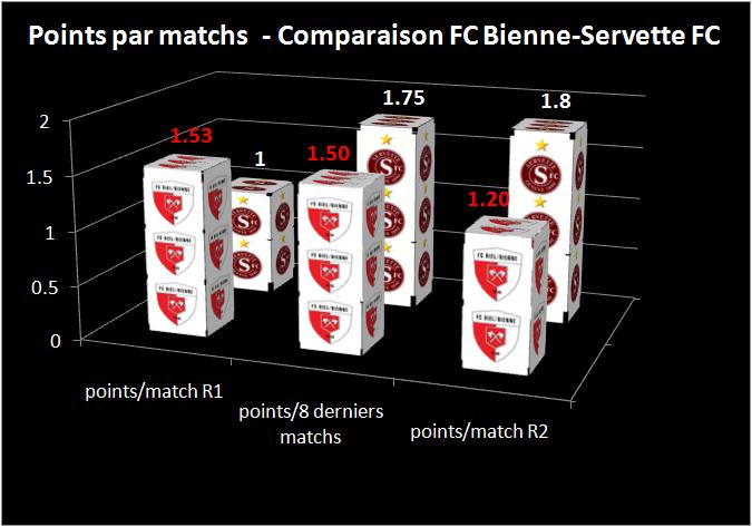 - Le premier tour a vu le FC Bienne finir à la 6ème place (1.53 points par match) et Servette à la 13ème avec 1 malheureux point par match