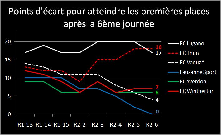 - Sans surprise, le FC Vaduz est aussi l’équipe qui a perdu le plus de « plumes » par rapport aux Grenats puisque l’écart est passée de 14 points à 4 (ou 7 si Vaduz bat Le Mont en match en retard)