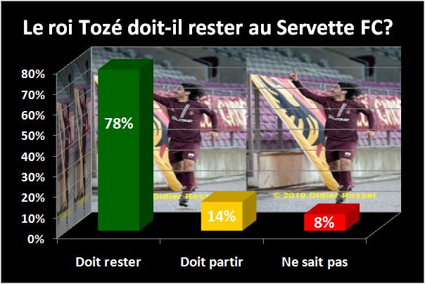 Plus de 250 personnes se sont exprimées sur le sujet du moment. Tozé, le meilleur buteur Servettien au premier tour et devenu le chouchou du public, doit rester au Servette FC car il sera un élément essentiel à la remontée vers l’Axpo Super League. Seul un petit 14% pense que Tozé devrait partir car il ne s’intègrera jamais au jeu actuel des Servettiens.