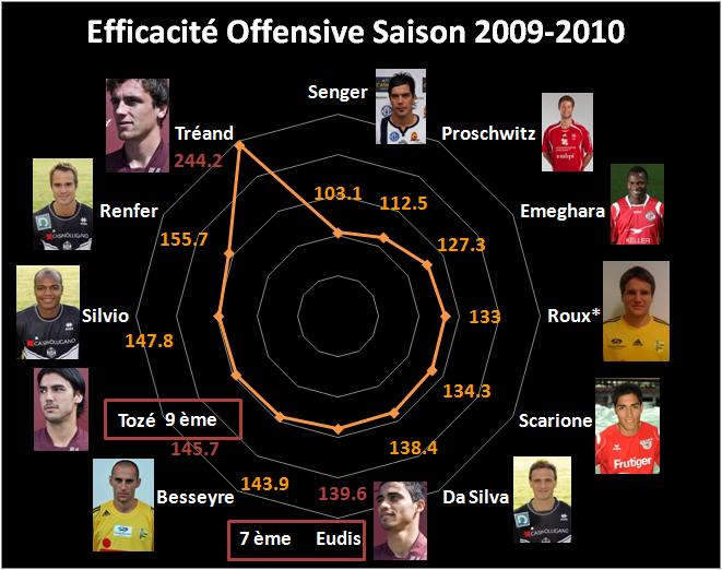 • Tréand, qui compte le même nombre de buts que Tozé (9 buts), est nettement moins efficace car il lui faut 244 minutes pour marquer un but