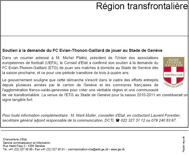 Quel bonheur de constater combien le sort du FC Evian Danone Gaillard, club pourtant construit à force de fusions de petits clubs français (ou d’absorbtion, c’est selon), intéresse le conseil d’Etat du canton de Genève. Il apparaît même en première position, c’est dire!