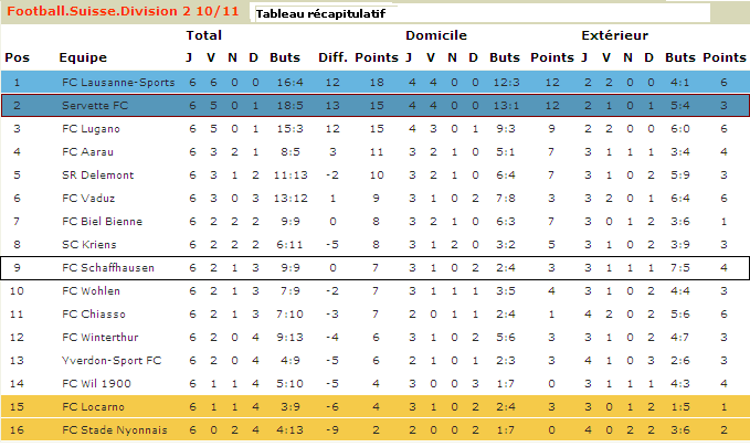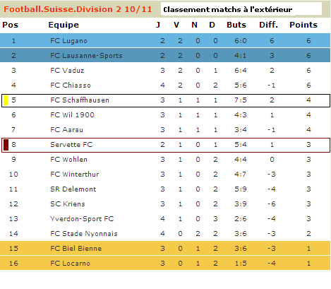 Pour les classements à l’extérieur, il reste également un peu boiteux, toutes les équipes n’ayant pas joué le même nombre de matchs hors de leurs bases. C’est le seul classement ou Schaffhouse nous devance (victoire à Nyon et nul à Aarau), mais avec un match en plus. Il faut espérer pour les servettiens que l’équipe qui se présentera au Breite ressemblera plus à celle de Vaduz qu’à celle de Winterthour…