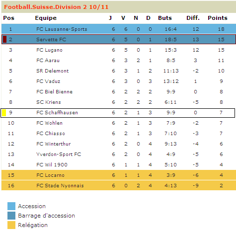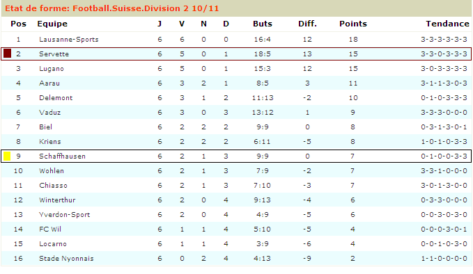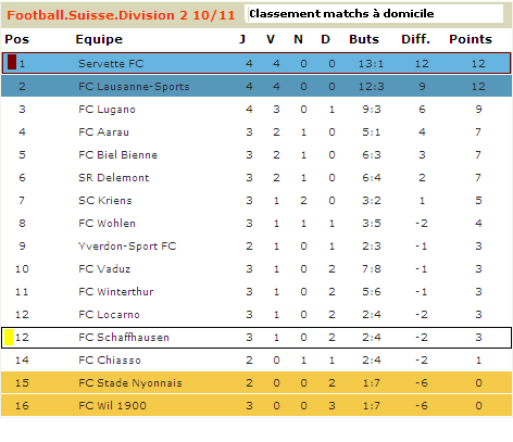 Pas de surprise, Servette (12 victoires consécutives à la Praille) et Lausanne (4 victoires en 4 matchs) trustent la tête du classement. Schaffhouse, après un premier succès à domicile, aura sombré dans son jardin du Breite lors des deux matchs suivants. Il faut noter tout de même que certains clubs ont déjà joué 4 matchs à domicile, alors que d’autres ne comptabilisent que 2 matchs à la maison. Quelle bande de blaireaux à Muri, pas capable de faire un calendrier qui tient la route…