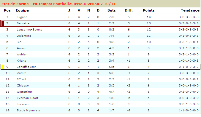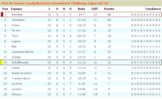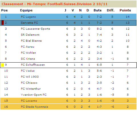 Ce classement un peu particulier nous renseigne en fait sur les performances des équipes lors des premières périodes de match. Si cette saison Servette marque souvent en fin de match, il n’en demeure pas moins que les Grenat ne font qu’enfoncer le clou en fin de partie car ils mènent déjà souvent d’une ou deux longueurs à l’entame de la seconde période. Schaffhouse pointe lui à la 9 ème place. Pas de grosse révolution donc, si les  matchs ne duraient qu’une mi-temps de 45 minutes, les deux clubs occuperaient la même position au classement que pour un match de 90 minutes.