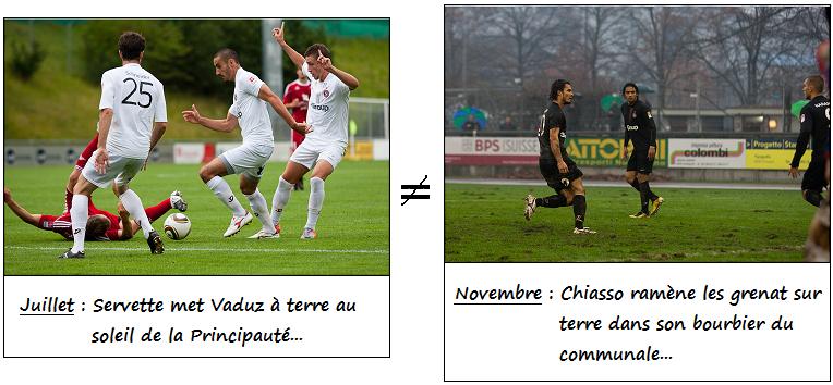 Comme le disait Carlos Alves hier sur notre site, les conditions n’étaient pas idéales à Chiasso pour que le Servette puisse exprimer tout son potentiel. Ce qui me chagrine, c’est que les conditions de jeu étaient connues dès le départ : temps dégueulasse et pelouse digne d’un champ de patate. Alors pourquoi donc s’évertuer à jouer de la même manière que lorsqu’il fait 25°C et que le soleil baigne nos corps enlacés (je parle des supporters…)? Les conditions ne sont plus les mêmes, elles ne sont pas favorables au jeu au sol et en mouvement du SFC. Et que change-t-on? Rien ou si peu…