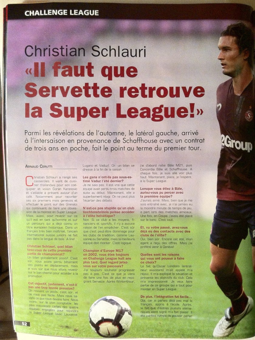 Les lecteurs assidus des EDS retrouveront un Christian Schlauri fidèle à lui-même, soit attachant et sympathique à l’interview. Contrairement à certains, il ne crie pas au scandale à l’idée que Vaduz puisse rejoindre la SL et barrer la route au SFC ou au LS, clubs de tradition qui doivent accepter la concurrence d’un club certes étranger, mais aussi doté de moyens sportifs et financiers respectables. Il rappelle en outre son ambition de découvrir la Super avec le SFC, quand bien même il déclare avoir reçu des offres de clubs de l’élite en été. Enfin, le champion du monde M-17 dit son bonheur de vivre l’expérience servettienne dans un groupe qui a fait de la montée un véritable rêve collectif.