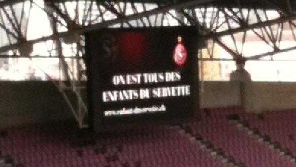 Merci au SFC d’avoir fait un lien (in)direct avec notre blog sur l’écran géant du Stade de Genève à l’issue du match livré par le SFC contre le FC Aarau. Nous ne l’avons malheureusement pas vu par nous-même, car l’après-match est pour nous rythmé par les interviews. Il semblerait en plus que ce soit déjà la seconde fois que les EDS aient les honneurs des deux écrans géants de la Praille.
