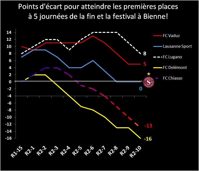 • La situation est similaire pour Vaduz s’ils venaient à perdre leurs 5 points d’avance sur Servette. Ils devraient gagner leurs 3 matchs restant par 5 buts d’écart.