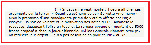 « On ne sait pas si Servette a songé à offrir une prime à la performance au FC Bienne, afin que les hommes de Philippe Perret se surpassent pour battre Lausanne mercredi soir à la Gurzelen. C’est en tout cas autorisé et il y a fort à parié que certains y songent. … » DV