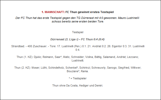 Pour sa première sortie amical avec Bernard Challandes comme entraîneur, les bernois se sont imposés 4-0 face au club de Dèrrenast (2ème Ligue Inter). A noter que notre ami Lustrigol aura scoré 2 but pour son retour sous le maillot thounois…