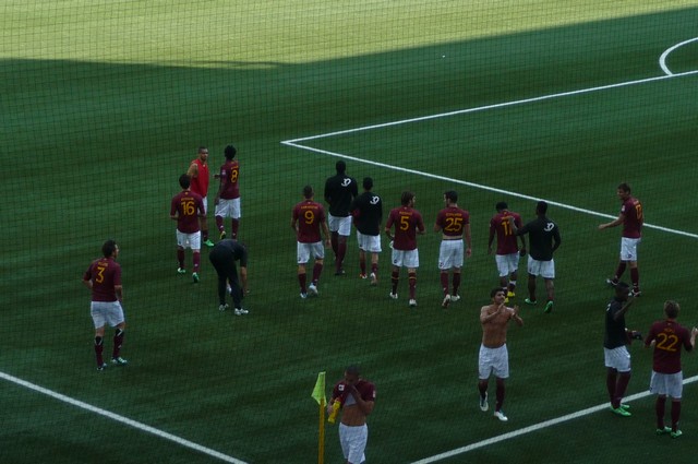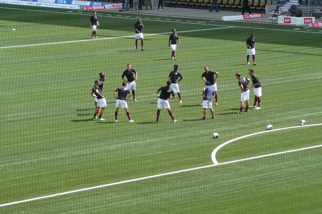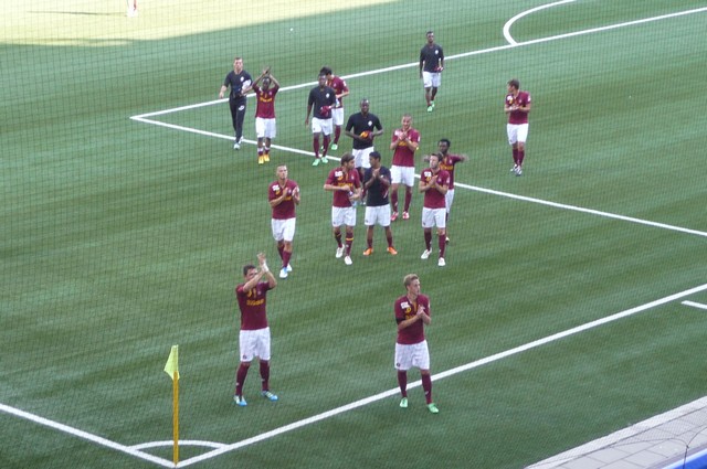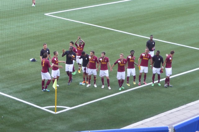 Le onze de départ, ainsi que les remplaçants en arrière-plan, s’échauffent. Routis retrouve sa place en charnière centrale avec Baumann. Schneider glisse sur le côté. Yartey fait ses débuts officiels en Grenat et Esteban reste sur le banc en joker.