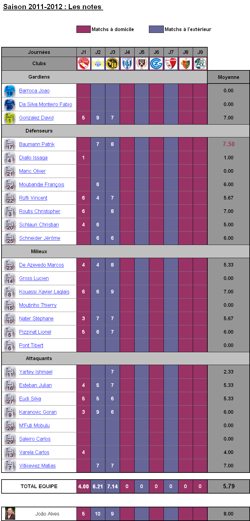 Alves (9) : Encore une fois, le druide portugais a brillé par l’excellence de ses choix. Osant titulariser d’entrée un joueur en manque de compétition officielle et se priver d’un demi axial à vocation défensive pour repositionner De Azevedo dans l’axe alors même qu’il évoluait à l’extérieur contre un redoutable adversaire, il aura apporté davantage d’équilibre à son système, le rendant plus offensif et redoutable. Le choix de son 11 de départ apparaît ainsi tout à fait cohérent. Certains ne manqueront peut-être pas de souligner que Moubandje, auteur d’une bonne entrée à Zürich, aurait pu prétendre commencer le match à la place de latéral. Mais João a sûrement apprécié, à juste titre, la dernière sortie de Schneider et a probablement misé sur l’expérience pour ce déplacement difficile. Garder Esteban en joker sur ce match et miser d’entrée de partie sur le plus grand gabarit d’Eudis est apparu être un choix judicieux. Ses changements sont intervenus au bon moment. Mieux, s’inscrivant dans une logique et une cohérence parfaites, ils auront même insufflé un nouvel élan à des grenats perdant de leur superbe au fil des minutes. Cherchant à s’imposer, João a tout tenté, faisant même entrer son 3e remplaçant pour le dernier quart d’heure. Cet esprit offensif est admirable. On en viendra cependant, au fil des minutes, à remercier le ciel de ne pas s’être acharné plus longuement sur les petits bobos de Kouassi ou de Gonzalez, sans quoi les Grenat aurait peut-être été contraints de terminer le match à 10 dans au sein d’un climat chaud bouillant… Quoiqu’il en soit, notre druide portugais a encore réalisé un grand match. Pour aller plus loin, la « presque victoire » des Grenat est avant tout le succès d’un collectif, d’une cohésion et d’une solidarité exemplaires. Pour cela aussi, tout le mérite en revient à João.