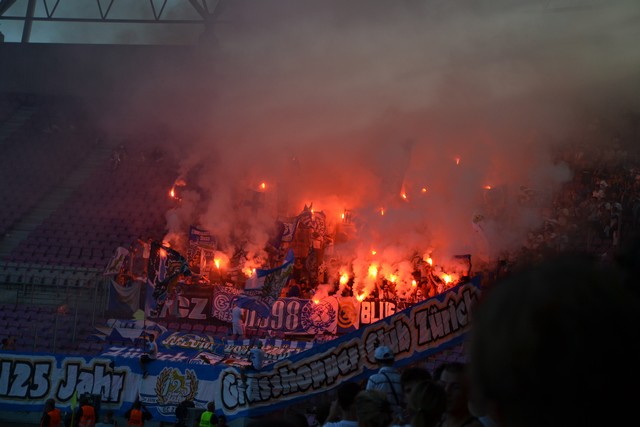 Les supporters de GC font une chorégraphie très lumineuse et fumeuse malgré l’interdiction des fumigènes dans les stades en ce début de deuxième mi-temps.