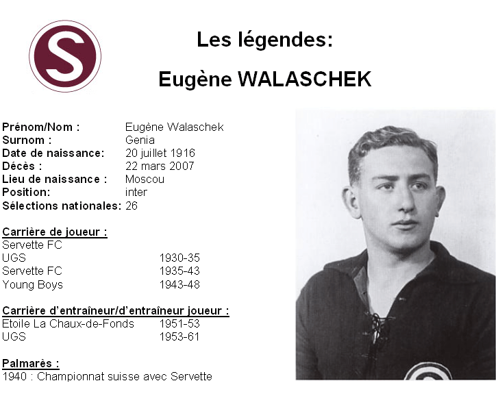 De 1943 à 1948, Genia Walaschek a joué pour Young Boys. En référence à Matthias Sindelar, le milieu de terrain star de l’Autriche à l’époque, Walaschek fut nommé le „sans papiers“ car pour permettre son arrivée en Suisse, il avait été déclaré comme fils de sa grand-mère Morel, ce qui lui a valu ensuite le retrait du passeport à croix blanche ! Il a donc joué ses premiers matchs internationaux pour la Suisse en tant qu’apatride. Au total, il a été aligné 26 fois en équipe de Suisse.