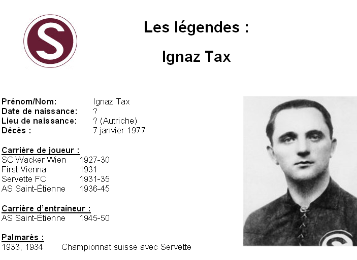 Servette connaissait à cette époque de grave problème de trésorerie et ne pouvait payer les salaires que sporadiquement. Tax a alors été transféré à l’AS Saint-Etienne pour la jolie bagatelle de 50 000 francs français. Début juillet, Tax fait son apparition dans la cité stéphanoise muni uniquement d’un visa de visiteur. Il y jouera au football durant les quinze années suivantes. La Seconde guerre mondiale prit une tournure amère pour Tax : il fut capturé, probablement lors de l’invasion de la France par l’Allemagne nazie en 1940. On ignore s’il a été fait prisonnier en tant que soldat ou qu’“Allemand du Reich“. Il a été interné en Belgique jusqu’à la fin de 1941. Il a ensuite regagné Saint-Etienne et a rejoué pour les Verts.