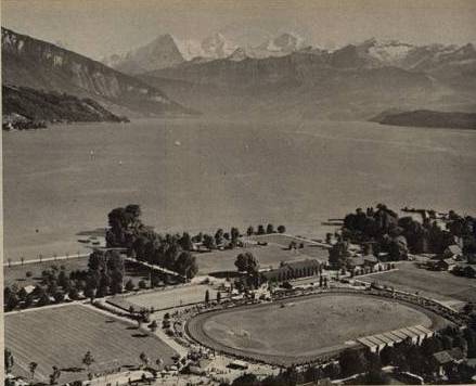Le hasard avait bien fait les choses : pile poil pour la montée du FC Thoune en LNA (les Oberlandais remplaçaient avec Lugano leurs rivaux cantonaux du FC Berne et du FC Bienne), le nouveau stade du Lachen, ou plus exactement son vestiaire et sa tribune, avaient été inauguré en août 1954. Le projet datait pourtant du milieu des années 1920… En 1949, l’Exposition cantonale bernoise est organisée au Lachen. La remise en état des lieux de l’exposition est l’occasion pour la municipalité, qui avait déjà déboursé 250 000 francs pour la consolidation des rives, de voter un crédit de 435 165 francs pour la première étape de l’édification d’un complexe sportif. Le résultat est superbe mais un vestiaire digne de ce nom (on utilisait les vieux bâtiments de l’Expo bernoise) et une tribune dignes de ce nom font encore défaut. Les cordons de la bourse municipale ne peuvent plus être desserrés. Habitants et associations sportives fondent alors une coopérative pour lever les 250 000 francs nécessaires. Ils y parviennent, entre autres grâce à l’aide de la société du Sport-Toto. En mai, les travaux débutent et à peine plus de 3 mois plus tard (parfois ça va vite !) le vestiaire et la tribune (1 000 places, capacité totale : 25 000 personnes) sont livrés. Sis dans son décor de carte postale, le Lachen est prêt, en remplacement du Grabengut, pour accueillir les équipes de LNA…