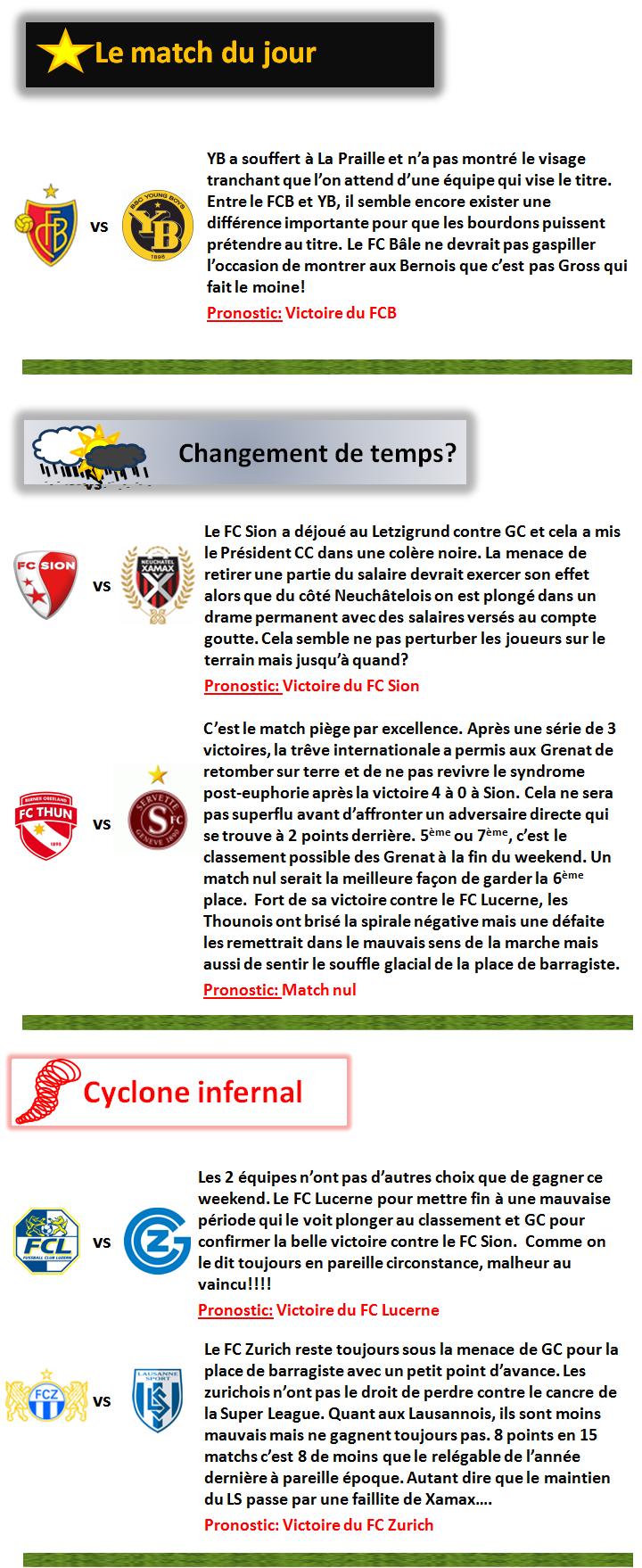 Les contours de la Super League se dessinent de plus en plus avec un FC Basel intouchable et un LS presque les 2 pieds dans la tombe. Par contre, les places du milieu de tableau vont bouger d’ici Noël et les matchs du weekend pourraient donner un nouveau classement.