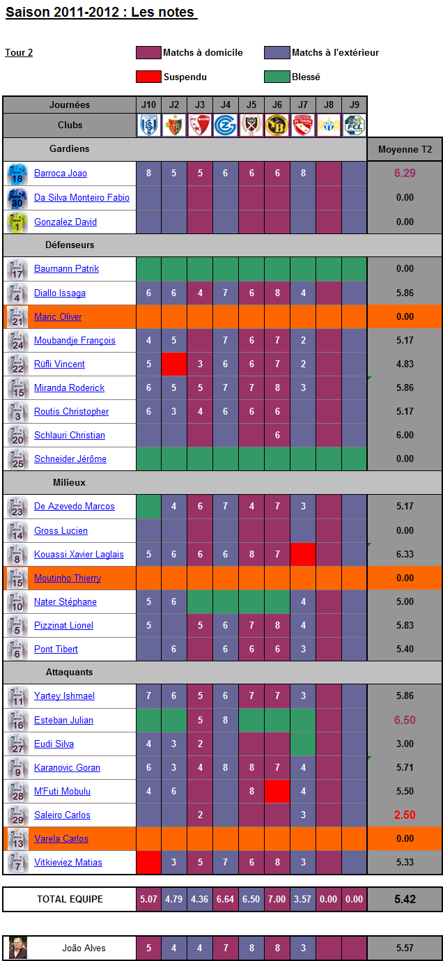 Alves (3) : Match compliqué pour notre entraîneur qui n’a pas réussi à continuer sur la pente positive des 3 derniers matchs. Il est en effet assez discutable de n’avoir aligné que Pizzinat en milieu défensif alors que Thoune aliss clairement chercher à jouer pour la victoire. Bref, un coup dans l’eau de João qui devra se rattraper dès dimanche en Coupe de Suisse…