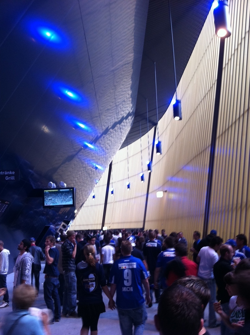 Les coursives du stade sont très bien terminées, les amis Lucernois nous devancent largement sur ce point. Les lumières bleus sont d’un très bel effet et les coursives sont très agréablement aménagée. Seul point négatif, celle-ci sont très étroite, ce qui rend le stade un peu difficile à quitter à la fin des matchs.