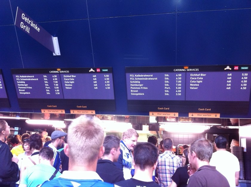 Nouveauté dans le stade de la Swissporarena, le paIement du catering se fait avec une carte à prépaiement, servant à la fois d’abonnement pour ceux qui l’ont. Pour les autres les cartes sont disponible à la Migros, cette dernière étant responsable food et beverage dans le stade. Le secteur visiteur fait évidemment exception avec heureusement la possibilité de payer son Schüblig ou sa bière Eichhof cash.