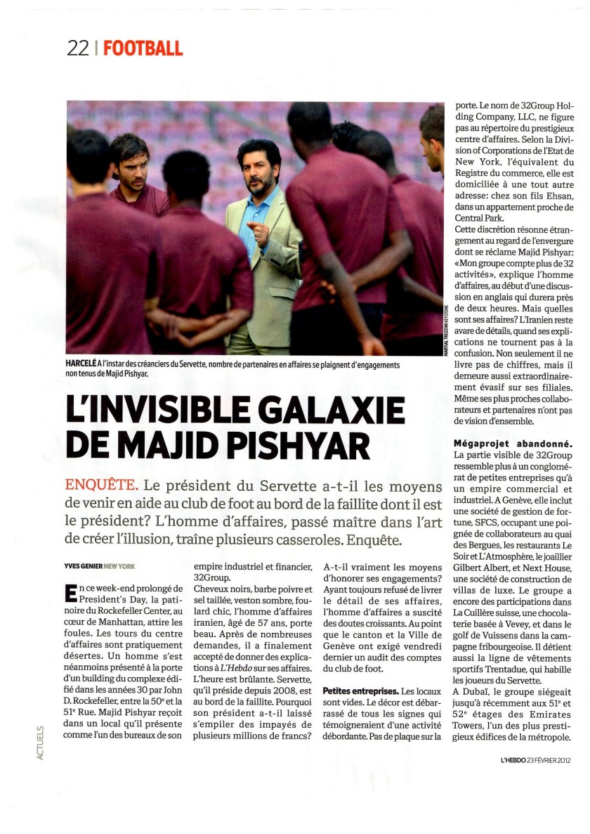 4. Voilà au moins un article de l’Hebdo bien plus documenté et argumenté que celui qui était apparu cet hiver dans le Matin Dimanche et qui affirmait, sans aucune preuve par ailleurs, que Majid Pishyar est bel et bien à la tête d’un « vaste empire financier ».