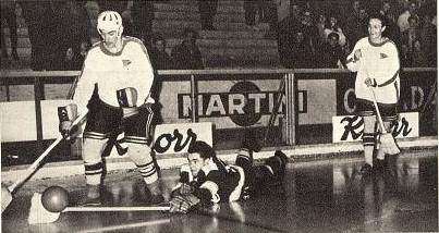 Patins au pied, canne à la main, puck au bout de la crosse mais sans casque, les footballeurs servettiens prennent le dessus sur leurs compères hockeyeurs. Quelques libertés sont prises avec l’interprétation des règles, ce qui explique cet inattendu succès des footeux. A noter toutefois que les experts du ballon rond pouvaient compter dans leurs rangs le gardien René Schneider qui avait commencé sa carrière sportive chez les hockeyeurs morgiens. On peut constater sa maîtrise consommée de ce sport de glace sur la photo ci-dessus. Sa doublure dans la cage des Grenats, Jacky Barlie, s’affaire en arrière-plan alors que Giulio Robbiani, attaquant au football, se charge cette fois-ci de garder les bois de son équipe !
