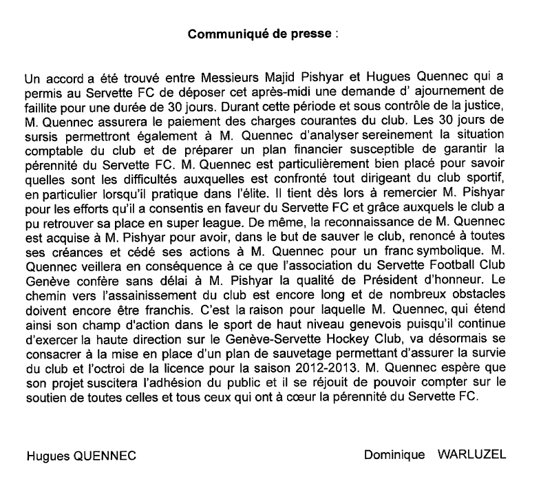 Le problème c’est que Servette n’obtiendra jamais sa licence pour l’année 2012/13 en Super League selon le réglement de celle-ci relisez-le vous verrez. Mais bon c’est mieux que la faillite du Club et le retour en 2 Ligue Inter là au pire Servette repard en Challenge League la saison prochaine et cela permet aux bons joueurs de se vendre pour la saison prochaine si la licence n’est pas donnée ce que je crains fortement.