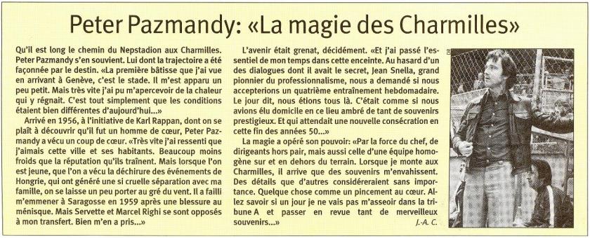 Des trois internationaux juniors que le FC Servette accueillait après l’insurrection de Budapest en 1956, Peter Pazmandy, qui arrivait de Vasas Budapest, était le moins coté à ses débuts en LNA. Il éprouva plus de peine que le puissiant ailier Nemeth et le fin distributeur Makay à s’imposer en première équipe. Or c’est lui qui accomplit finalement la plus longue et la plus fructueuse carrière dans le monde du football helvétique.