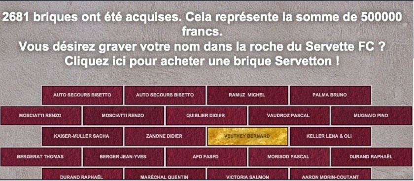 2’681 briques pour un montant de 500’000 francs, soit un don moyen de 186.50 francs. Les Genevois jouent le jeu et c’est tant mieux! Mais ce n’est pas encore la fin du Servetton, le SFC ayant toujours besoin de soutiens financiers pour prouver à la justice genevoise que le club peut subsister à ses besoins et avoir un avenir que l’on espère radieux!