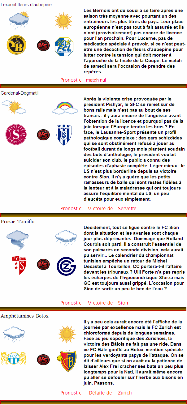 Les clubs de Super League entament les quatre ultimes rondes de championnat dans des configurations physiques et mentales diverses. Si certaines équipes sont déjà en mode Nivea, d’autres vont trembler, de joie ou de peur, jusqu’au bout. Nos ordonnances.Germinal Walascheck
