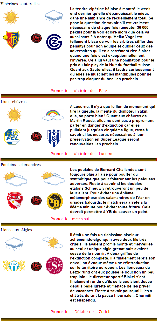 A l’occasion de la journée des espèces menacées, penchons-nous sur les petites bestioles qui peuplent la Super League ainsi que sur leur biotope. Certaines sont plus en danger que d’autres, à court ou à moyen terme.