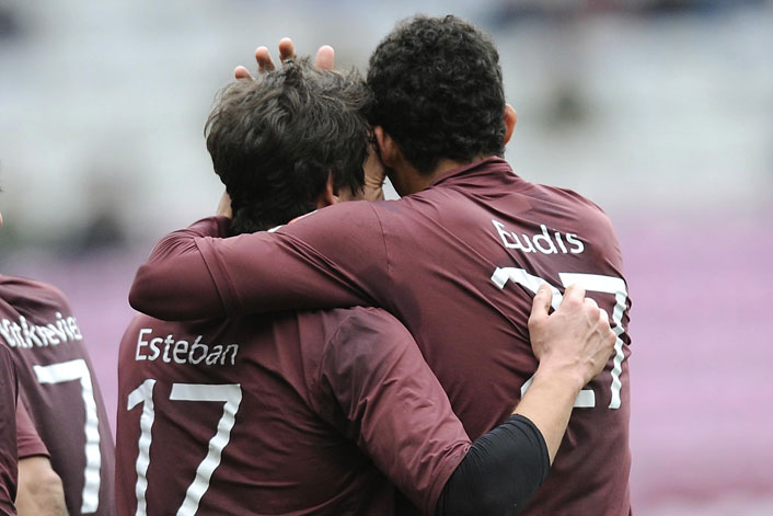 (La joie des Grenat qui signent leur deuxième victoire en championnat un soir de… décembre 2009.)