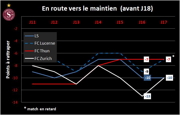 - Lucerne (s’ils gagnent leur match en retard), le FC Zurich et le LS ont une avance très confortable de 10 points sur les Grenat. Sauf faux pas répétitifs, il semble que seul le FC Thoune peut tomber dans le piège de la relégation. Mais le football réserve toujours ses surprises…Le printemps s’annonce très chaud!