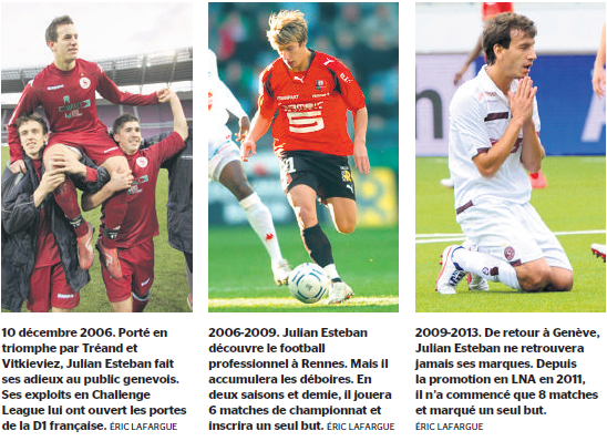 Julian Esteban, c’est un talent pur, qui a vraiment explosé en Challenge League dès 2006. Avec des performances exceptionnelles, il a attiré les recruteurs de toute l’Europe. Un soir, Alain Roche, du PSG, est venu au Stade de Genève voir le prometteur prodige. C’était lors de Servette-Lausanne. Après 25 minutes de jeu, Lausanne menait 0-3 et Esteban, comme tous les Grenat, était transparent. Roche se disait qu’il avait fait le voyage pour rien. Et puis Esteban s’est réveillé. Deux buts, deux assists, victoire 4-3 de Servette. Roche voulait immédiatement recruter le Grenat, qui signera finalement à Rennes.