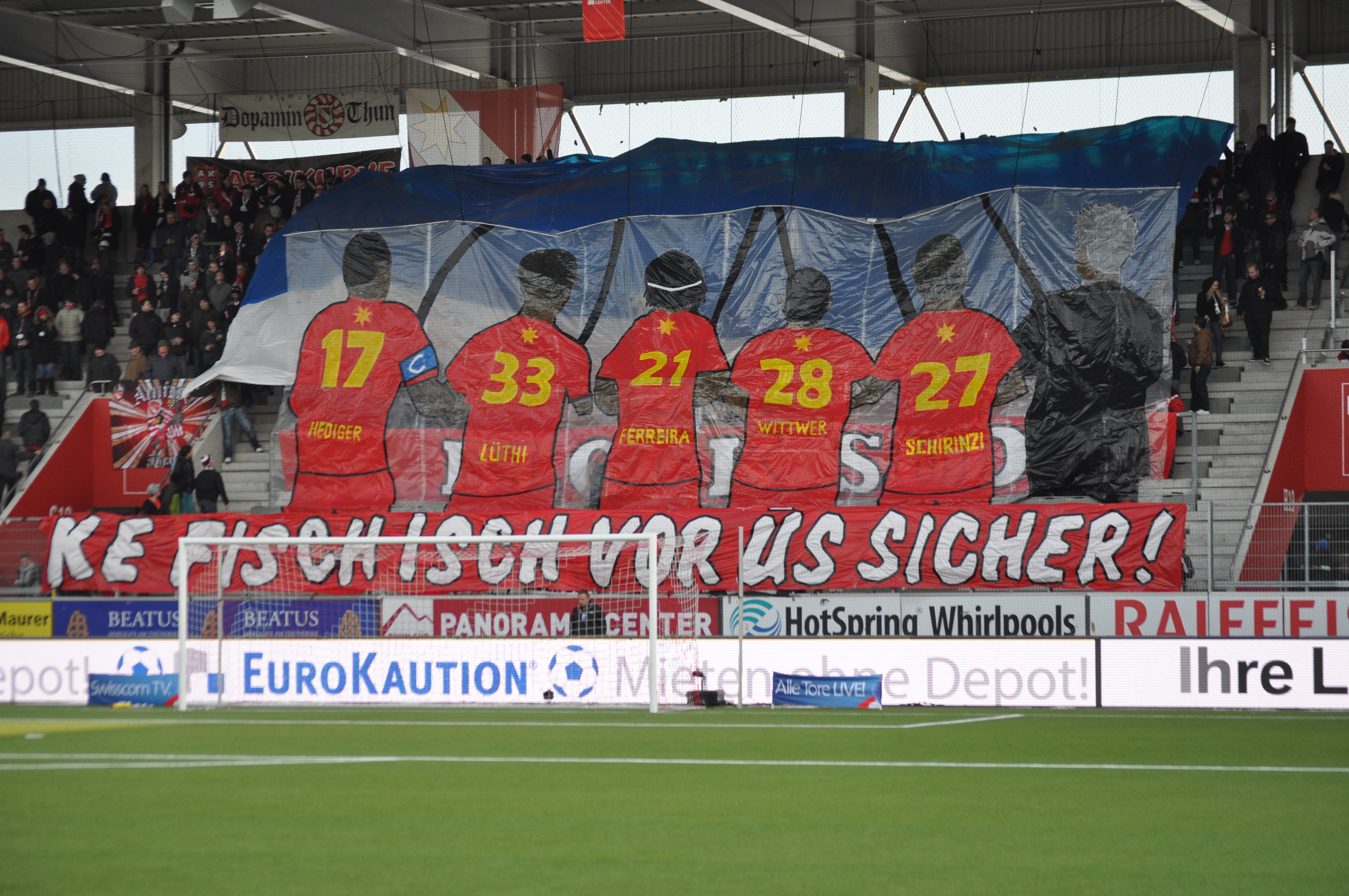 Ke Fisch isch vor us sicher, c’est du suisse-allemand. En allemand, cela s’écrirait Kein Fisch ist vor uns sicher, ce qui veut dire Aucun poisson n’est sûr devant nous. C’est bien évidemment une allusion à leur entraîneur Urs Fischer. (Der Fisch = le poisson, Der Fischer = le pêcheur