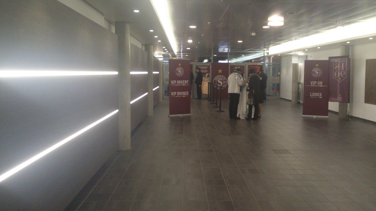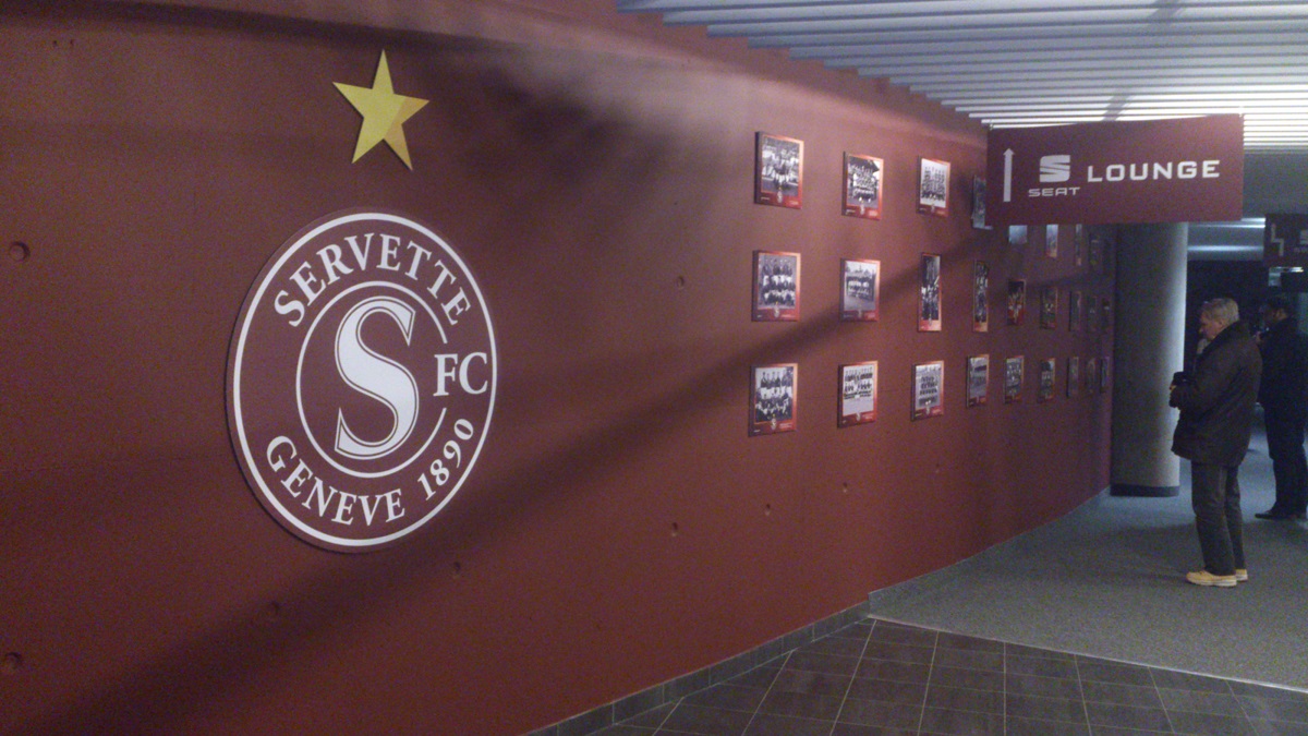 Alors que le Servette FC a repris les reines de la société d’exploitation du stade, quelques progès se font désormais ressentir, notamment dans le secteur VIP. Appliques lumineuses, peinture grenat, murs décorés aux couleurs du club, tapissé du logo et des photos qui on fait la légende du Servette FC.