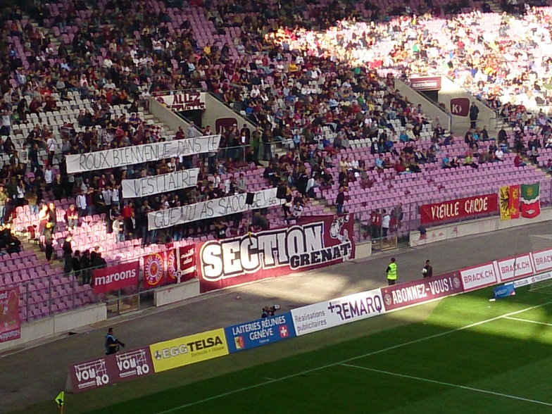 • Jocelyn Roux a eu droit à un accueil des plus clairs. Une banderole « Roux, bienvenue dans le vestiaire que tu as saccagé! » a été déployée par la SG, suivi d’un chant des plus accueillants : « Roux, Roux, on t’encule! » On a connu mieux pour mettre en confiance un nouveau joueur amené à revêtir le maillot grenat 😉
