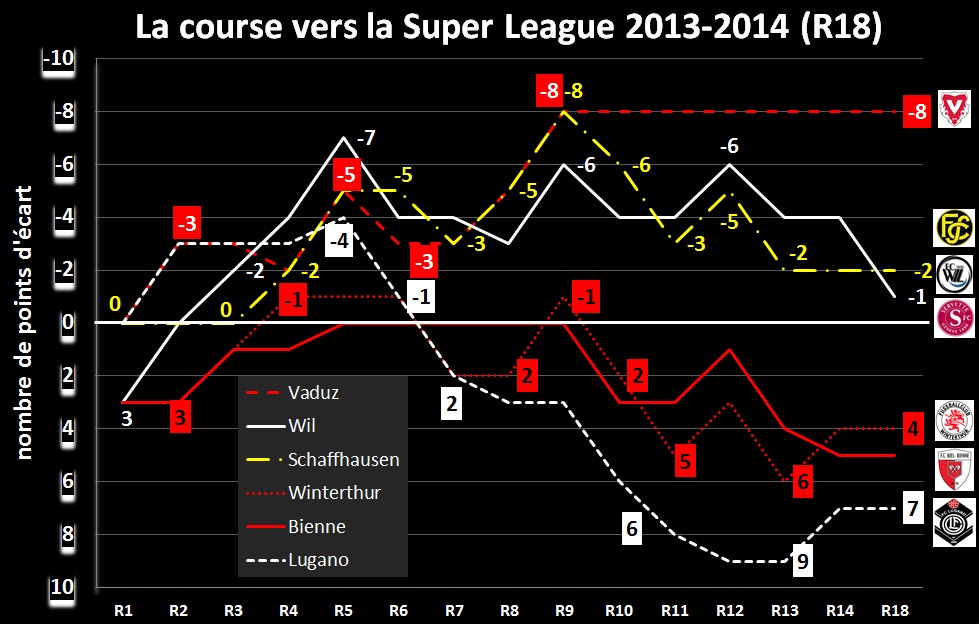 - Servette, malgré son excellent parcours, retrouve toujours 3 concurrents devant lui qui sont Wil, Schaffhausen et Vaduz