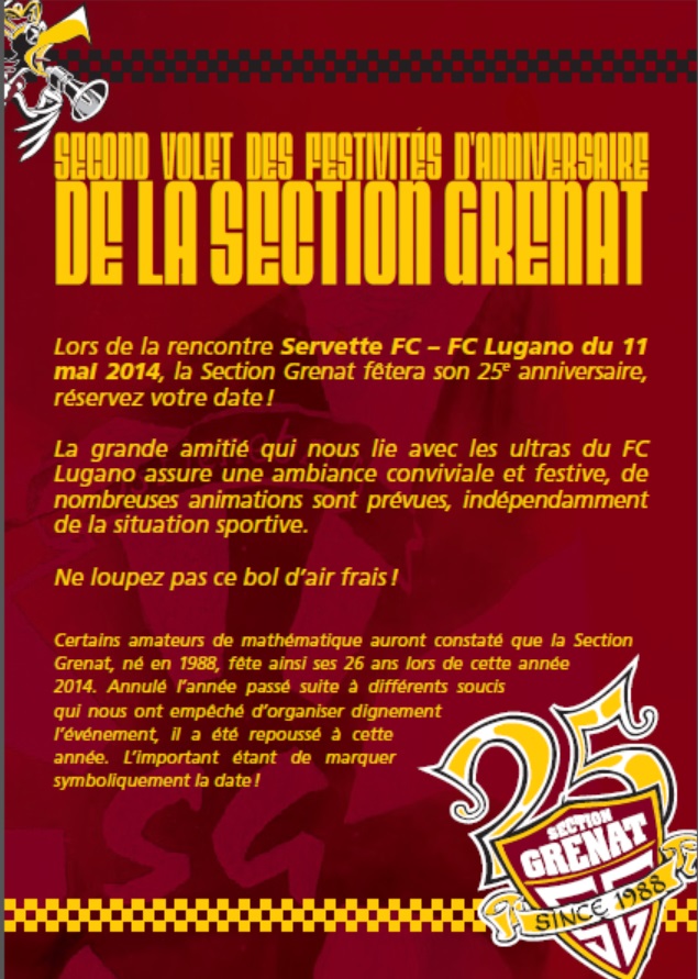 Inamovible motivateur, la Section Grenat a fêté l’année dernière ses 25 ans d’existence. Déplacé à cette année , les festivités auront pour cadre le Stade de la Praille avec en toile de fond l’amitié liant la SG avec les Ultras du FC Lugano.