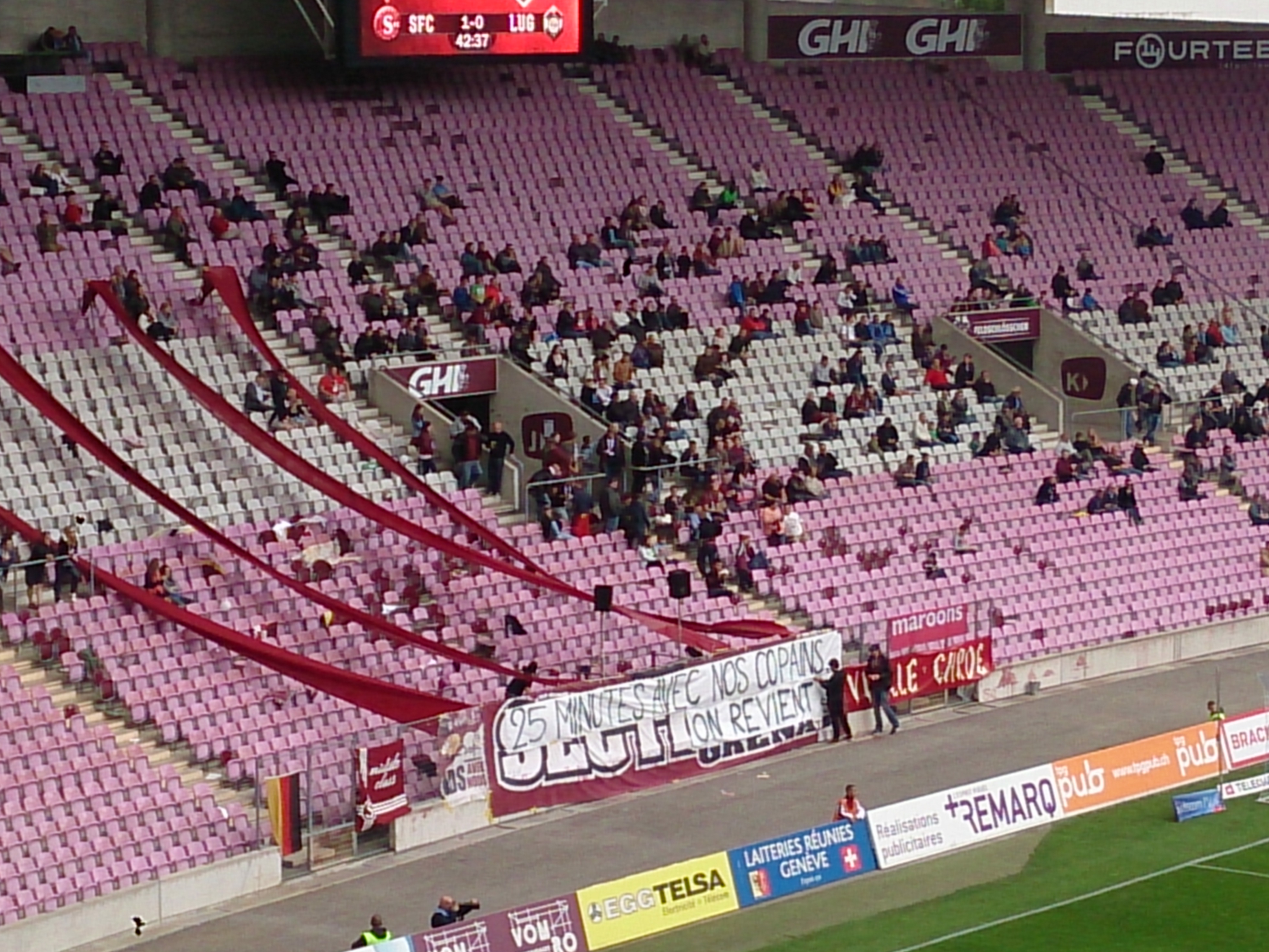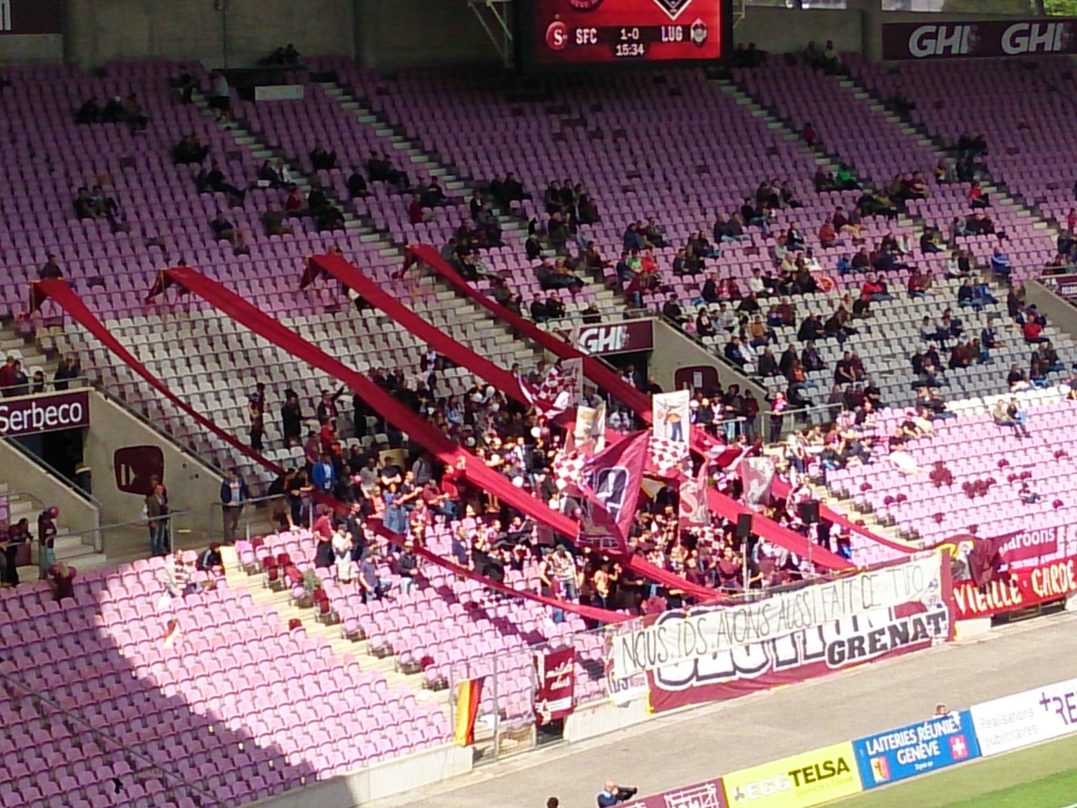 Suite aux 25 ans de la Section Grenat fêtés dignement dimanche dernier, le comité de la SG a souhaité nous apporter quelques précisions sur les interdictions de stade (IDS) frappant le groupe. Retrouvez également quelques photos des animations du match face au frère luganais…