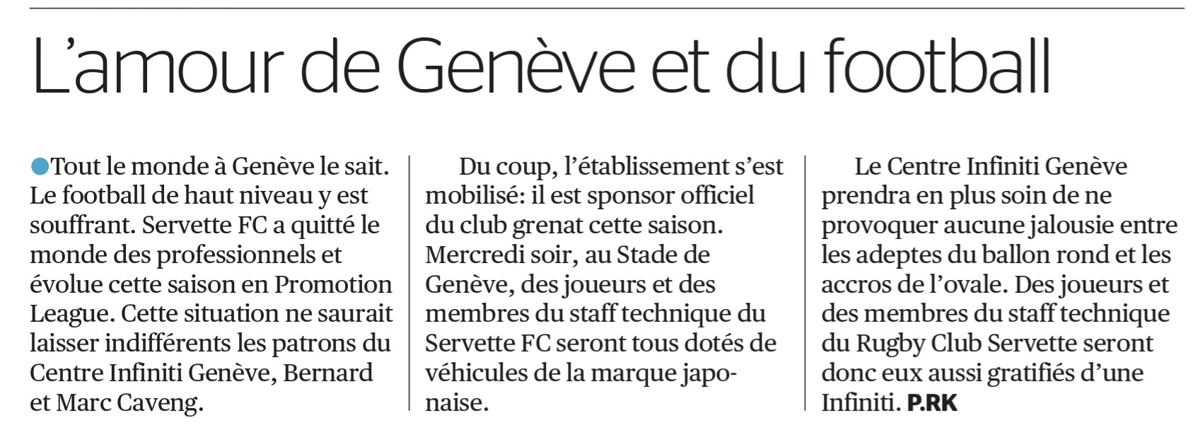 Afin de soutenir le Servette FC, les patrons du Centre Infiniti Genève seront sponsor officiel du club grenat cette saison. Mercredi soir, au Stade de Genève, des joueurs et des membres du staff technique du Servette FC seront tous dotés de véhicules de la marque japonaise.