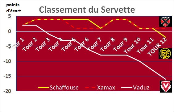 • pour la première fois Servette passe devant Schaffouse et compte 2 points d’avance sur eux et ont une meilleure différence de buts (15 vs 12)