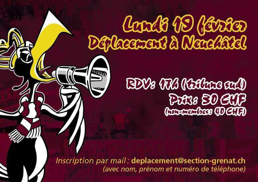 Pour les fans grenat désirant se rendre à Neuchâtel pour soutenir le Servette FC dans ce match si important, la section Grenat vous propose le déplacement CHF 30.- pour les membres et CHF 40.- pour les non-membres.