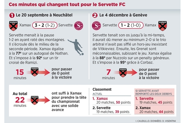 Julian Karembeu : Cette différence se retrouve quand-même dans le chiffres (voir l’article de la TDG Xamax et Servette face à la loi du dernier quart d’heure) où Neuchâtel a gagné 14 points dans le dernier quart d’heure de ses matchs alors que Servette en perd 4 dans ce même laps de temps…