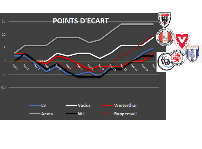 - Cette victoire permet non seulement d’éloigner Winterthur à 3 points et le LS à 5 points mais de garder Wil à 2 points (différence de buts de +6 donc 8 buts de moins que nous) et Aarau qui reste à 14 points donc ils devraient gagner 5 fois pendant que nous nous ayons 5 défaites , pour nous passer devant. Les argoviens passent sur la barre et ne sont plus lanterne rouge et laisse privilège à Chiasso qui est à 2 points et qui recevra Kriens. Sans oublier Vaduz