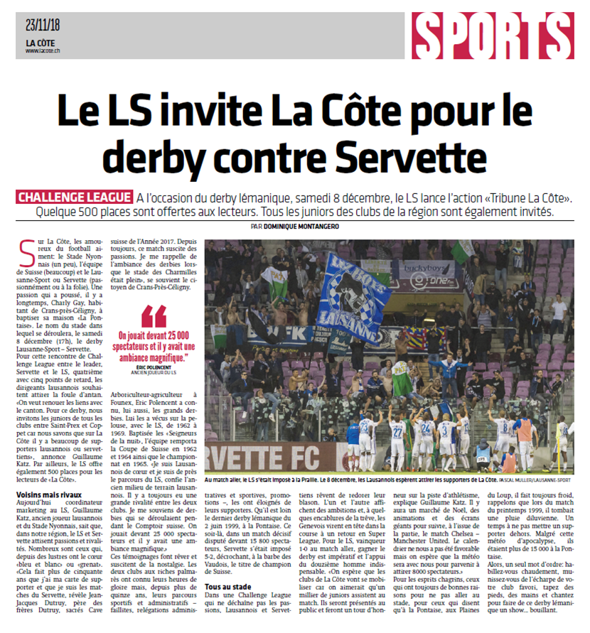 Le LS se bouge pour le derby et c’est tant mieux, il risque d’y avoir du monde à la Pontaise! Au total ce sont plus de 1’000 invitations qui sont mises à disposition des footballeurs, entraîneurs, accompagnants et habitants de la région par le Lausanne-Sport. 500 de ces invitations sont offertes par le Journal la Côte!