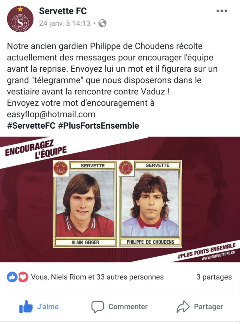 Le Servette FC relaye une belle action de soutien de la part de l’ancien gardien du SFC Philippe de Choudens : « Notre ancien gardien Philippe de Choudens récolte actuellement des messages pour encourager l’équipe avant la reprise. Envoyez lui un mot et il figurera sur un grand « télegramme » que nous disposerons dans le vestiaire avant la rencontre contre Vaduz !