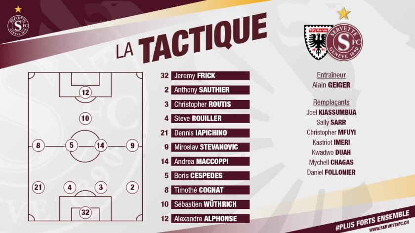 Bon, ben quel match il y a beaucoup beaucoup à redire! D abord la compo de départ, frileuse avec 2 demis défensifs, ce bon début de match, mais cette incapacité à marquer, et derrière notre défense qui fait preuve de naïveté et de manque de rigueur, sans compter la faut absolument débile de Sauthier. Luis Geiger logiquement sort un demi défensif pour un attaquant, et oh, miracle, mais ça marche… on revient à 2-2… par contre après le 2-2, gros couo de pompe de l équipe, coupée en 2, sans bloc équipe, avec 2 énormes boulettes de Frick qui s y met aussi… déjà à ce moment là Geiger aurait du stabiliser l équipe, ou alors lancé Duah et non Follonier (déprimant de faiblesse, mais qui a le droit de jouer lui…. au contraire de Duah!!), et là miracle du gardien argovien qui offre le 3-2 sur un plateau, sur notre seule occasion après le 2-2… et là alors qu il reste 2!!! Changements et qu on mène miraculeusement, notre coach n a meme pas l intelligence de BETONNER CE RESULTAT en faisant entrer Imeri ou Sarr ou les 2…. sortir Alphonse et repasser à 2 demi défensifs, voir à 3 centraux derrière, et si vous regardez l action qui amene le penalty (pas scandaleux arretez vos pleurnicheries!!), 5!!! Joueurs servettiens sont battus au départ de l action. 90e minutes et 5! Joueurs sont beaucoup trop hauts! Non vraiment je suis en colère ce soir! Bref au final : toujours des joueurs pas au niveau, physiquement ya un réel problème, la transition OFF – DEF est à nouveau inexistante, et la prestation de toute la ligne défensive sur le plan Defensif est absolument indigne d un candidat à la montée! Espérons que dimanche cela finisse aussi sur un nul mais je suis réellement fâché!