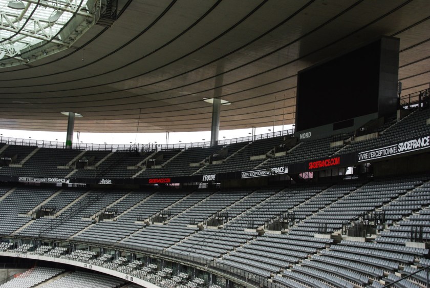 Le Stade de France. le premier anneau tout-en-bas est composé de sièges gris clair, les deux anneaux du dessus sont en gris moyen.